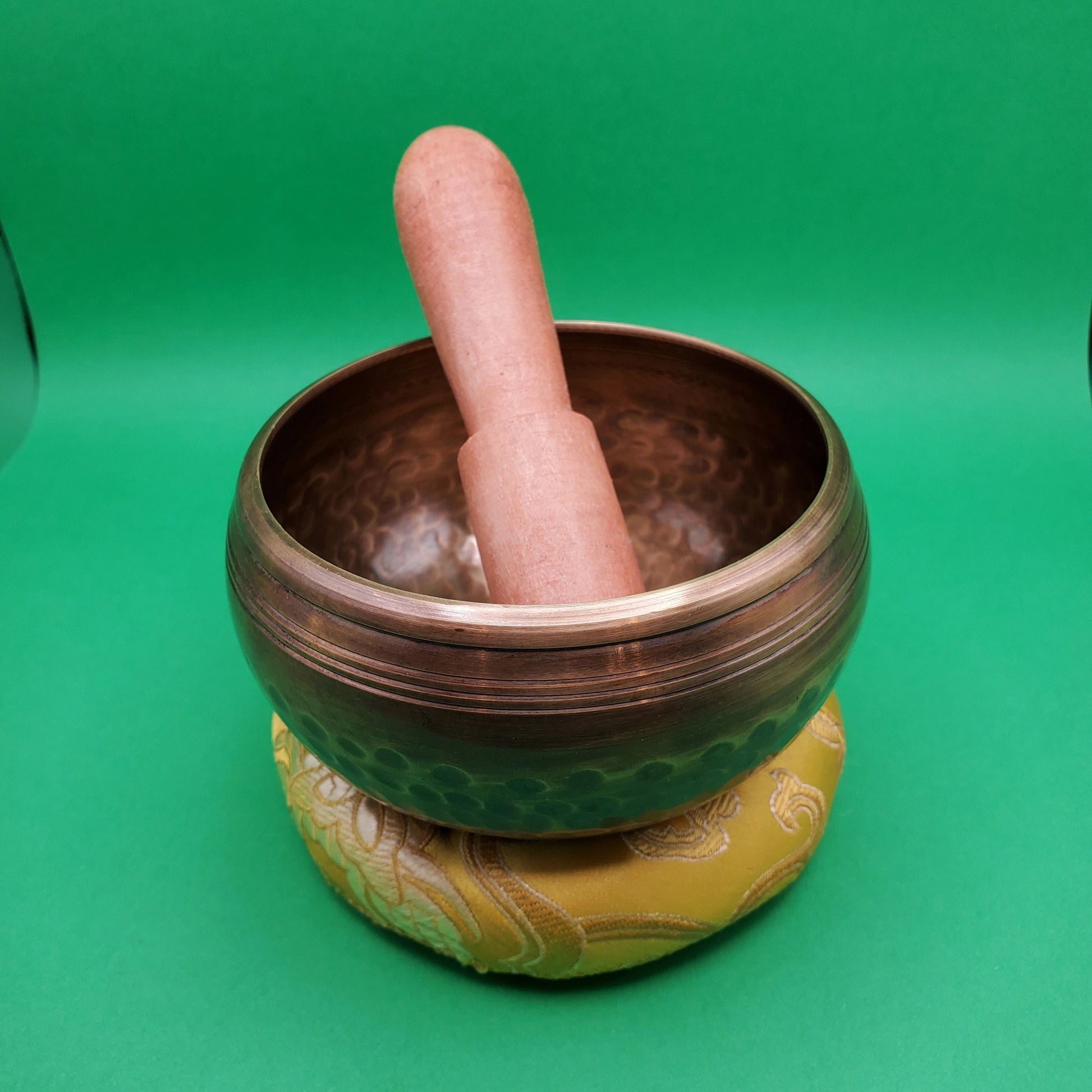 This handmade hammered copper singing bowl is tuned to produce a beautiful, rich tone. Crafted with skill and precision, it's perfect for meditation and mindfulness practice. Its unique shape and copper construction lend a warm resonance that can fill a room with stunning sound.